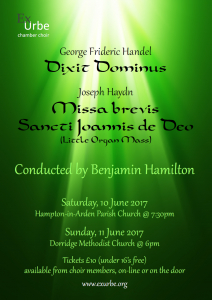 One of the choir has let me know about a concert by the Ex Urbe choir coming up very shortly which may be of interested. I have attached a concert poster which provides all of the details but in case you cannot open this then briefly the concerts will be on Saturday, 10 June @ Hampton Parish Church starting at 7:30pm and Sunday, 11 June @ Dorridge Methodist Church starting at 6pm. ExUrbe will be performing Dixit Dominus, by Handel and the Little Organ Mass, by Haydn.